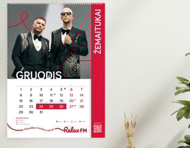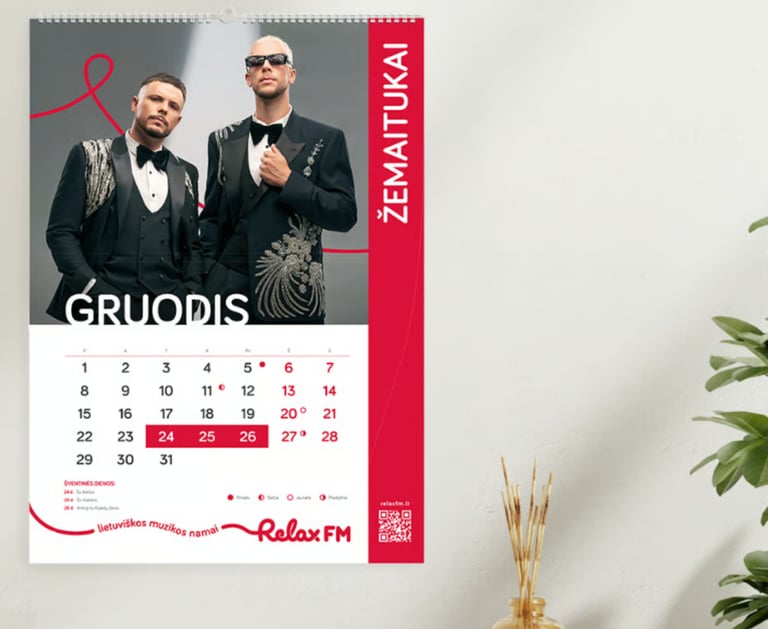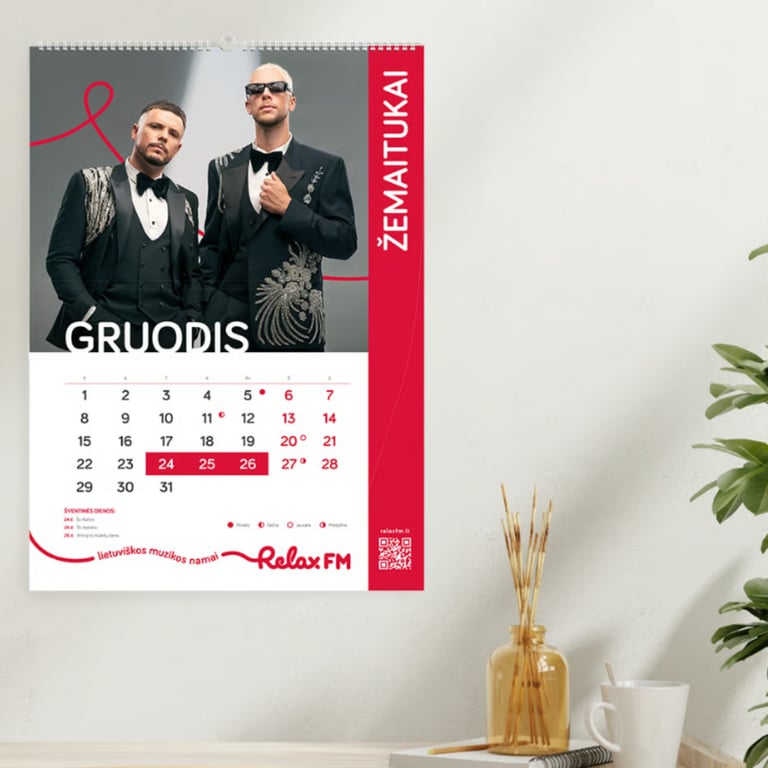 Tai prabangus, stilingas ir išskirtinis sieninis kalendorius mėgstantiems lietuvišką muziką. Čia rasite net 12 mylimų ir populiariausių Lietuvos atlikėjų bei grupių, kurie lydės jus visus metus kartu su radijo stotimi Relax FM.